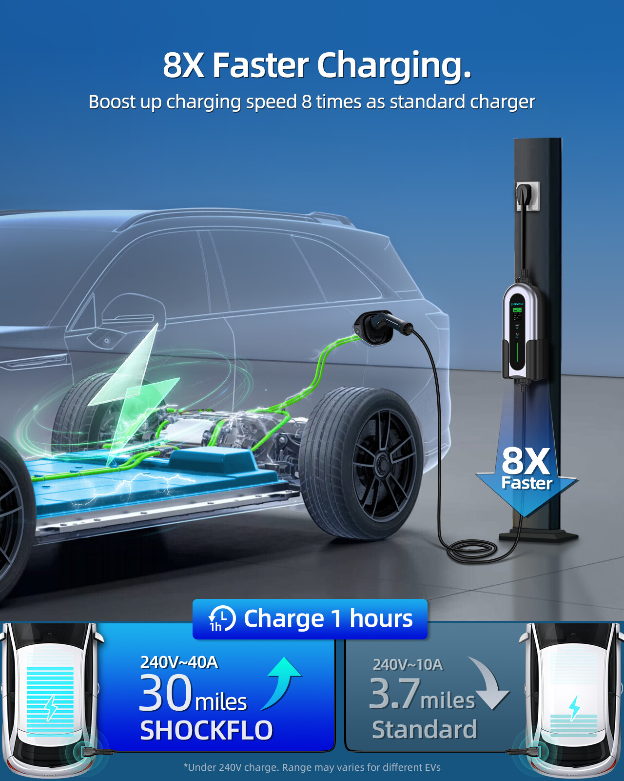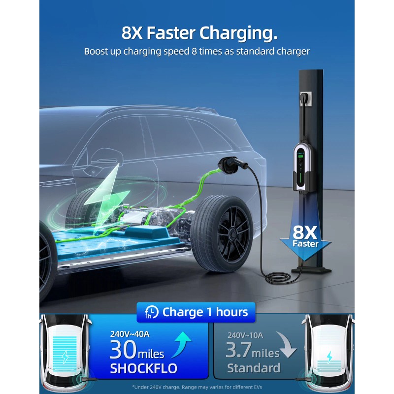 8X Fast Charging: The SHOCKFLO 40A EV Charger charges your car to 30 miles per hour in just 1 hour, with a NEMA 14-50 plug and 240V charging power that's 8 times faster than a standard charger.