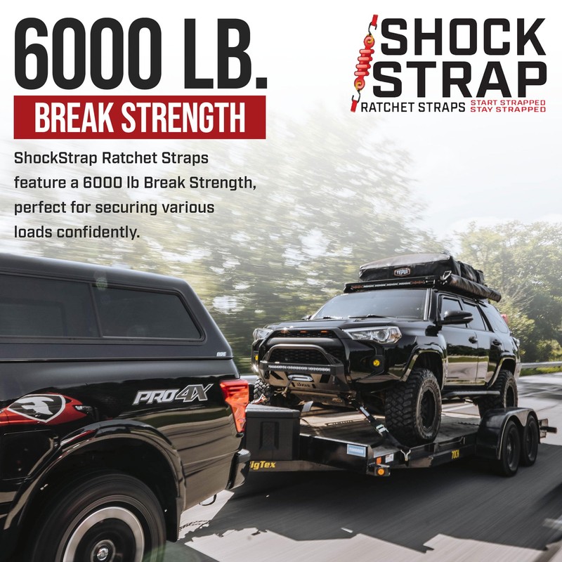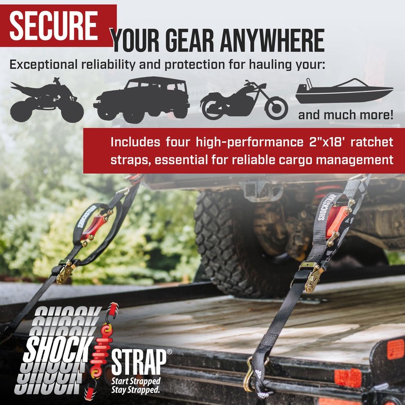 SHOCKSTRAP Ratchet Strap, 18’ x 2” Shock Absorbing Heavy Duty Tie downs for Cargo, 2,000 LB WLL / 6,000 LB Break Strength, 4-Pack