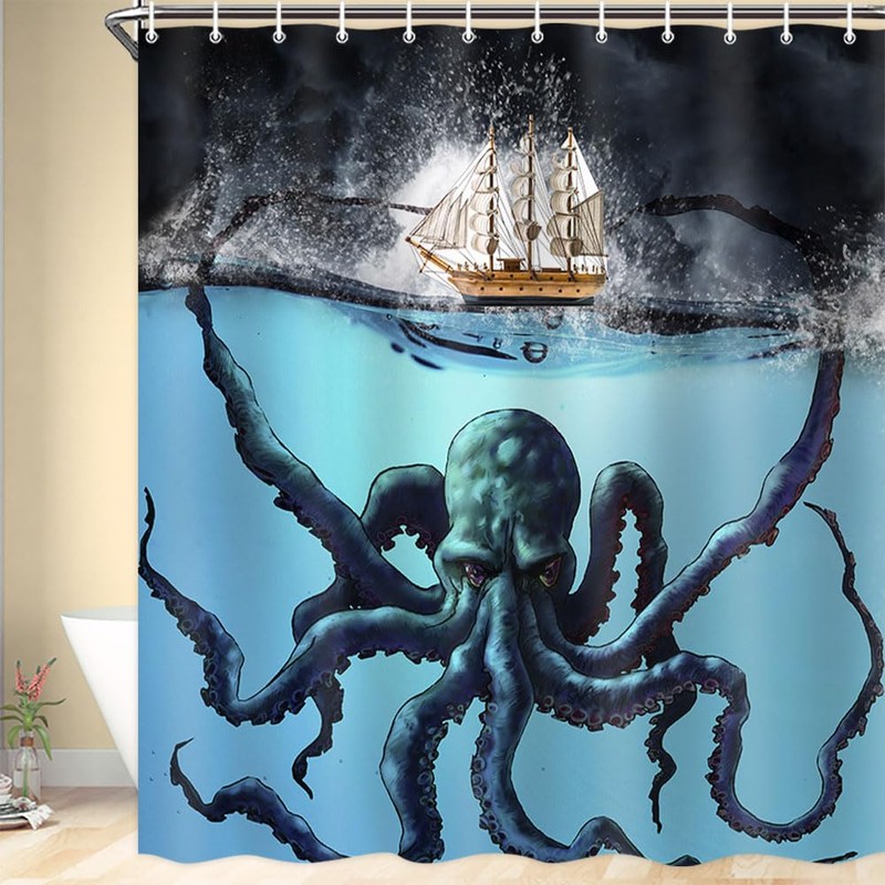 Shocur Black Nautical Octopus Shower Curtain, Funny Ocean Kraken Tentacles Attack Pirate Ship, 72 x 72 Inches Polyester Fabric Bathroom Cool Decor Set with 12 Hooks