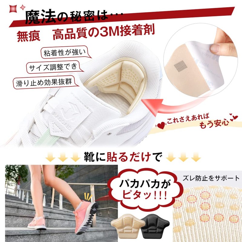 - (4D Design Prevents Slipping) The 4D design of the heel pad has been updated to fit the heel, making it perfect for foot pain and shoe stays. Ergonomically designed to gently wrap the heel without any 4-way blind spots below and left and right. The anti-slip silicone particles have been added to the surface for a good fit, making it the perfect sole supporter for those who have trouble with shoes such as pumps, sneakers, and other shoes that may slip or adjust their shoes