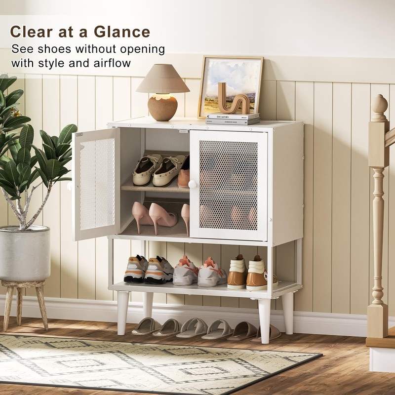 - 【Breathable & Visible Mesh Doors: See at a Glance, Breathe Freely!】 This shoe rack for entryway lets you easily find your favorite pair through the stylish diamond mesh doors—no more blind rummaging! Its modern design and elegant mesh detailing add a decorative touch that enhances the look of any entryway or living space. It promotes excellent airflow to keep shoes fresh for longer, naturally eliminating odors!