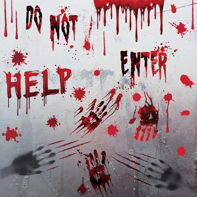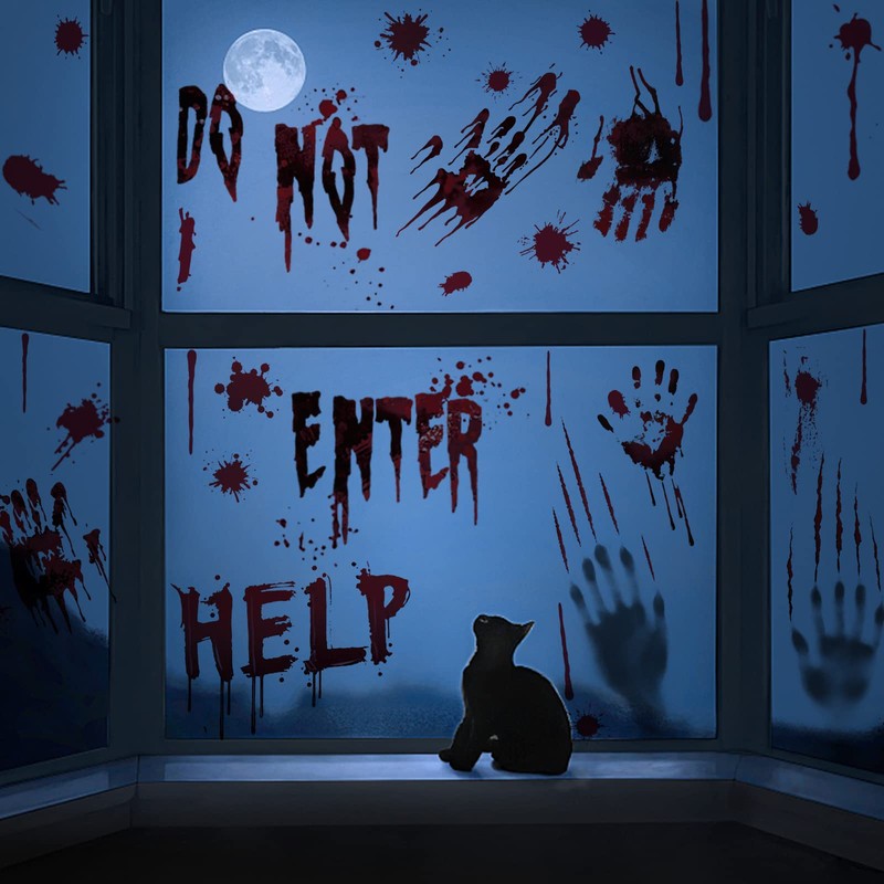 - Scary Halloween decorations: life-size bloody handprint window clings, bring you to the horror crime scene. Create creepy entrance to your Halloween party or haunted house with these bloody decals. Like creepy Halloween decoration, definitely all trick-or-treats crawl!