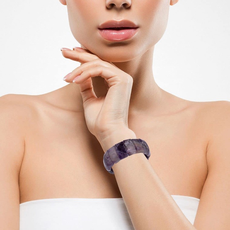 - Serenidad de vidrio: esta impresionante pulsera púrpura cuenta con piedras preciosas de amatista rectangulares naturales de alta calidad. El diseño es simple pero llamativo, perfecto para cualquier ocasión. Se cree que la amatista aporta claridad y paz a la mente despierta.