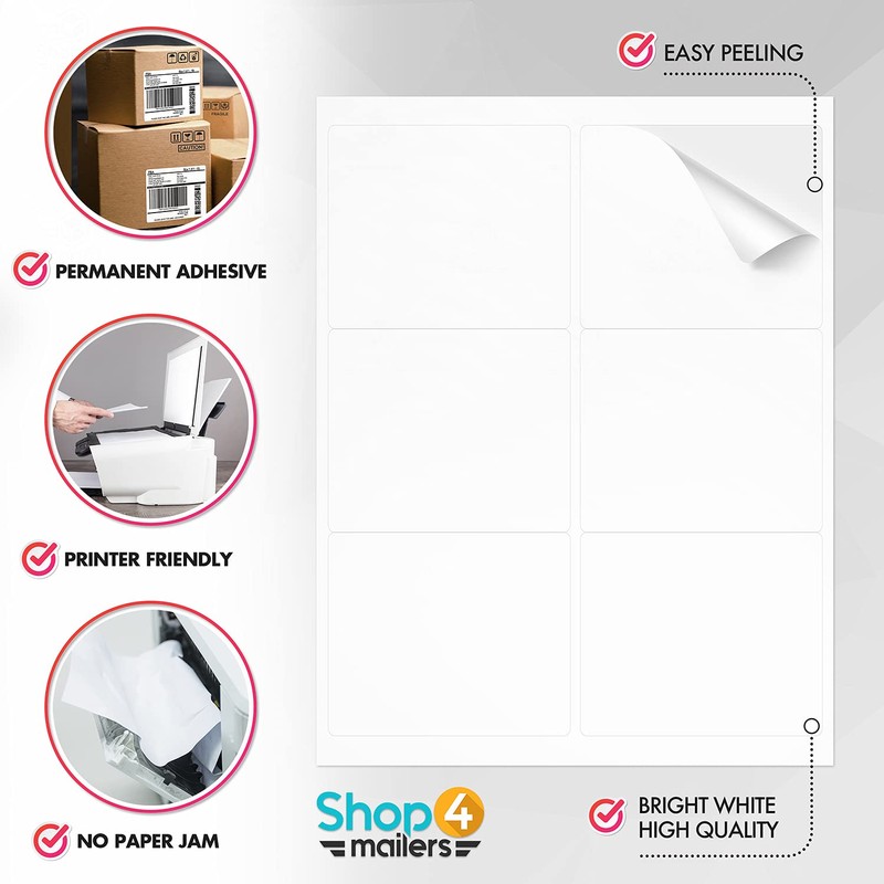 Shop4Mailers 6-Up White Permanent Self Adhesive Shipping Labels 3 1/3” x 4” Easy Peel Stickers for Laser & Inkjet Printers - 100 Sheets - 600 Count Labels