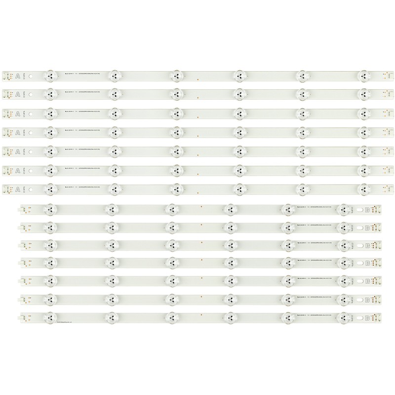 14 pcs PLEASE NOTE: These strips have been manufactured to replace the original strips. These strips utilize an updated lens style that has less of a tendency to break off of the strips. These strips are also compatible substitutes for: LN54M550060V12 LED STRIPS LA62M55T120V12 LED Strips IMPORTANT: Many models use various different sets of LED strips. Please match the original strips in your TV to those shown in the picture before ordering. If you are replacing LEDs in an TV, it is recommended that you install the latest TV software after installation to minimize the risk of repeat LED failure. On Smart TV models, please update software from the Setup menu. For non-Smart TV models, please visit 's TV support website for update instructions.--- NC550DUN-SAAP1 LED Backlight Strips Set (SEE NOTE) 55LN5400 55LN5200 55LN5700 NEW!