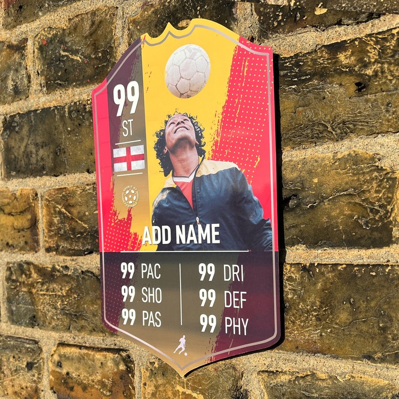 Personalise Football Player Stats Card A4 metal sign plaque wall art. Printed aluminium 0.5mm metal plaque, 11 x 7 inches. Would look great in any bedroom, bar or office, great home wall art. A4 approx. (28 x 17cm) size with sticky pads so you can fix to the wall.Customisable with your Own Photo Player Name, Team & Nation, Position & Overall rating, Stats (Pace, Shooting, Passing, Dribbling, Defending, Physical).