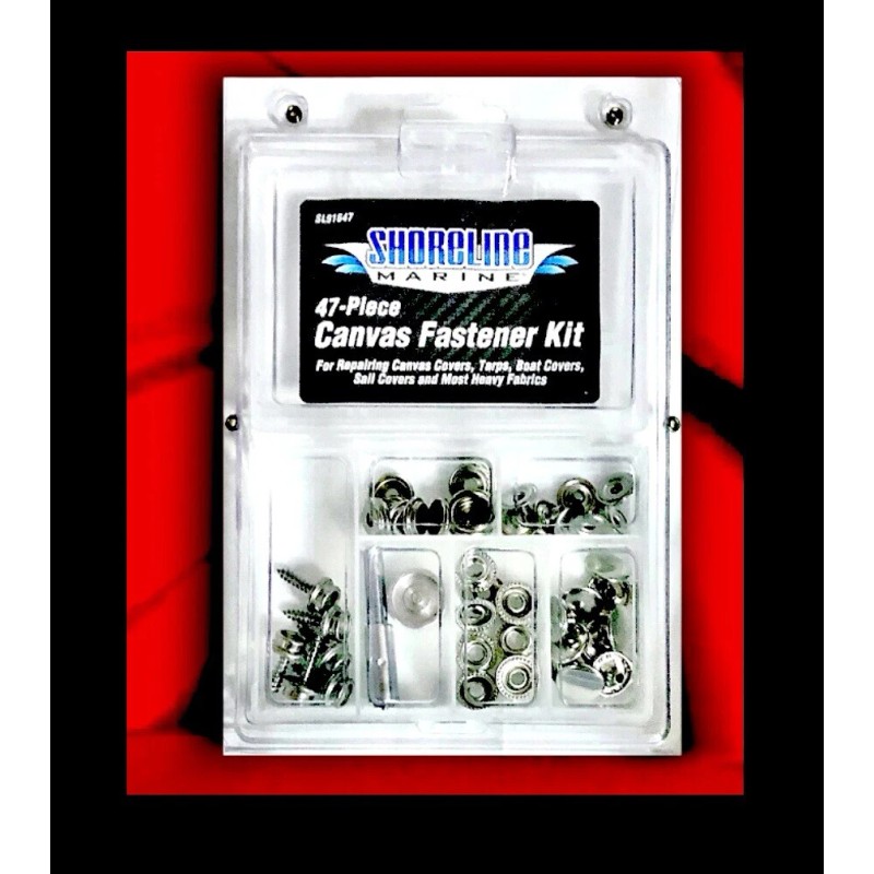 - Shoreline Marine Canvas Fastener Kit, Assorted, 47-piece is for major and minor repairs of canvas covers, tarps, boat covers, sail cover or any heavy fabric.