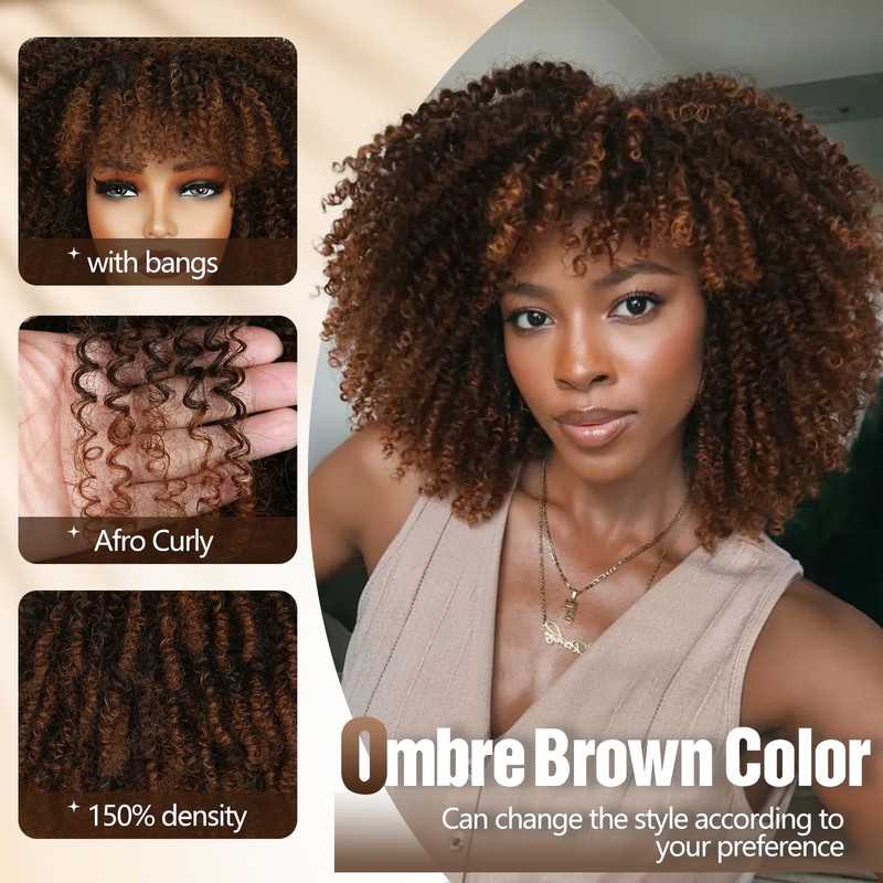 Short Afro Kinky Curly Synthetic Wig, Glueless Curly Bob Wig with Bangs Highlight Curly Wigs for Black Women Heat Resistant Fluffy Wigs For Daily Party Cosplay Use(14inch,Ombre Brown)