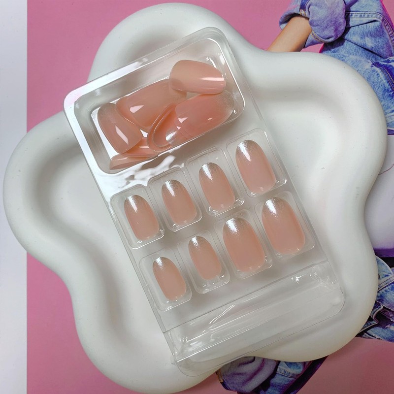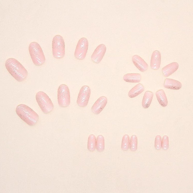 Short Fake Nails Almond Press on Nails Light Pink Acrylic Nails Glossy Glitter Glue on Nails Translucent Artificial Nails Simple & French Stick on Nails for Women 24 Pcs