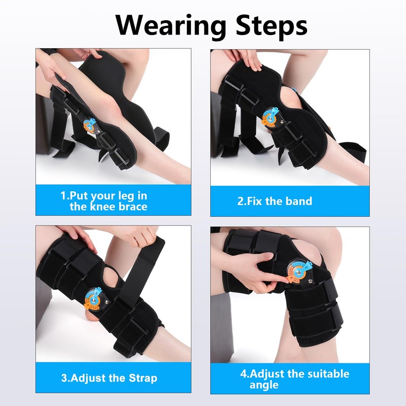 - đăHinges with Controlled ROMă: The stabilisers on both sides provide stability and protection for weak and injured knee joints, significantly reduce the strain on the kneecap and provide strong support for your knee joint. The range of motion of this hinge and locking wheel knee brace can be adjusted from 0° to 120° to meet the specific needs of the patient during rehabilitation.