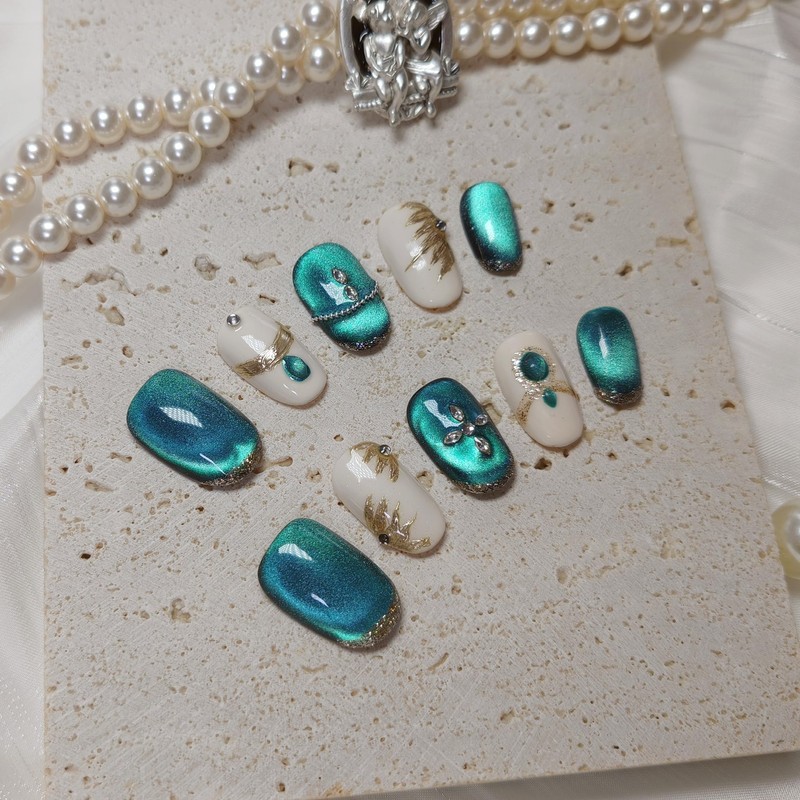 Short/Medium Oval Nails Handmade French Tip Press on Nails with Designs, Cat Eye/Aurora Women Reusable False Nails (Turquoise, Medium)