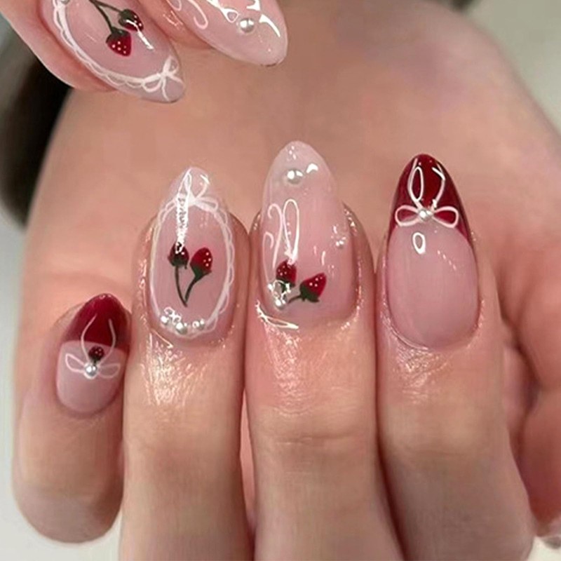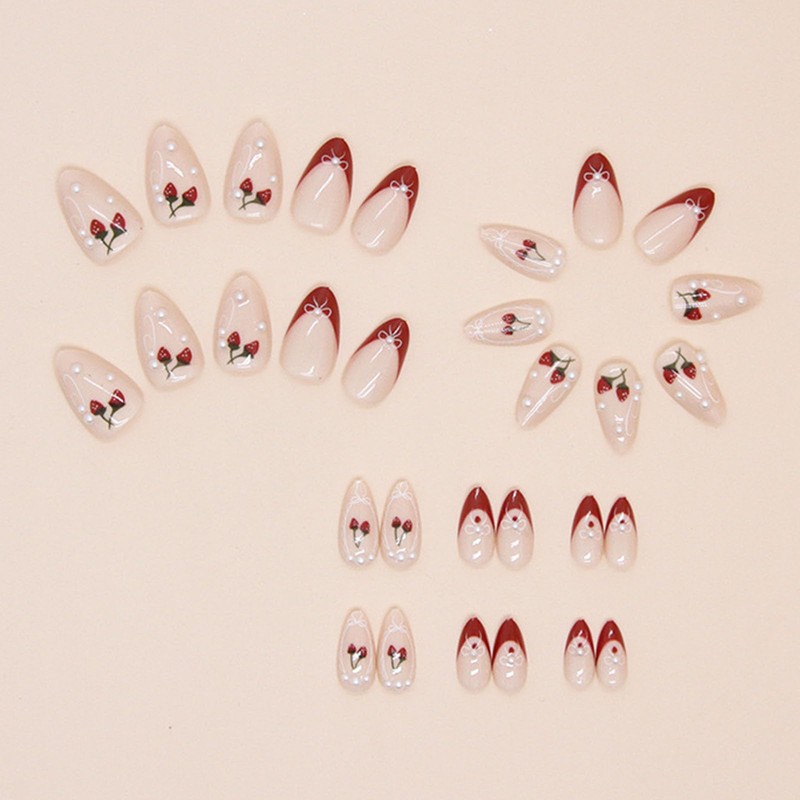 Short Press on Nails Almond Fake Nails with Pearls Bow Fruit Designs Red French Tip Glue on Nails White Lines False Nails Press ons Glossy Stick on Nails for Women 24 Pcs