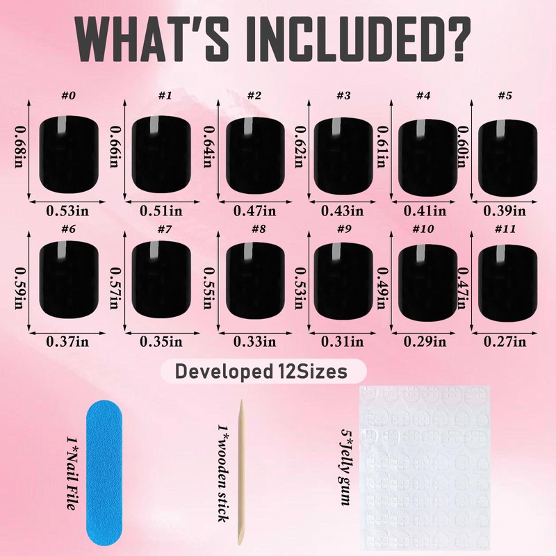 - What you get: Short press on nail kit includes 240pc short square black nails in 12 sizes, to ensure a perfect fit for every fingernails. Each pure acrylic nail comes with 5 sheets of high quality jelly sticky tabs, 1pc nail file and cuticle stick. Everything you need for nail manicure are included. Enough artificial nail quantity choices for you to create your own finger nail design style; save the time and money of going to the salon