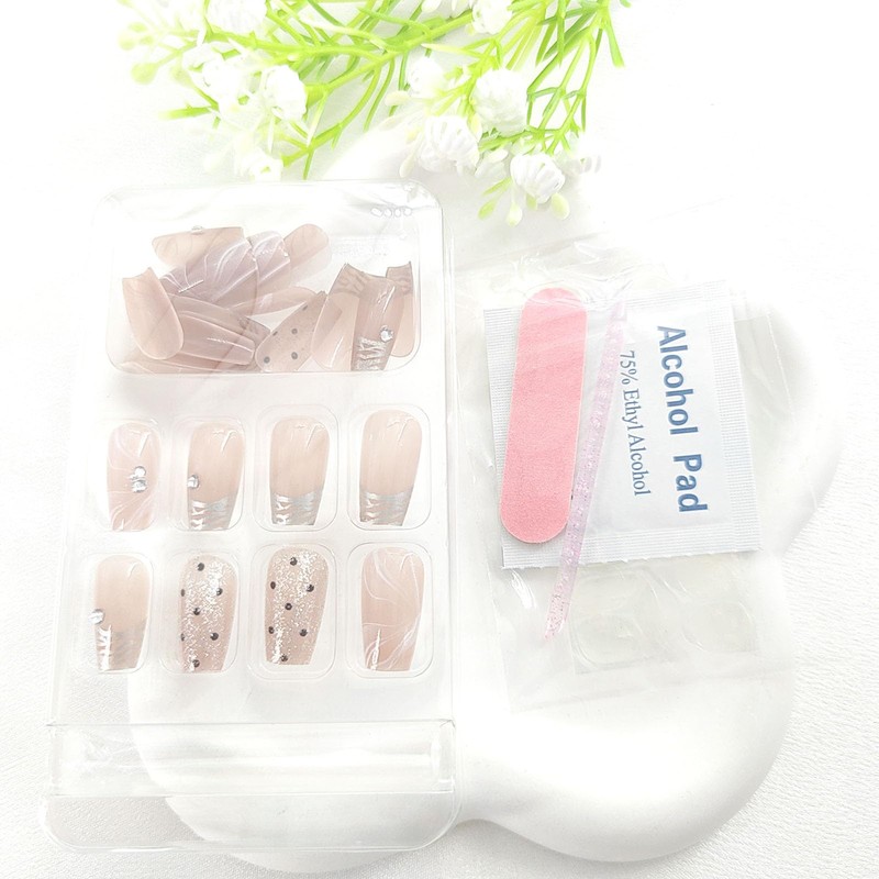 - Package: A box of 24 pieces of press on nails short coffin 24 pieces of jelly glue 1 small wooden stick 1 nail file and alcohol bag. Our set does not include glue.