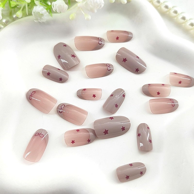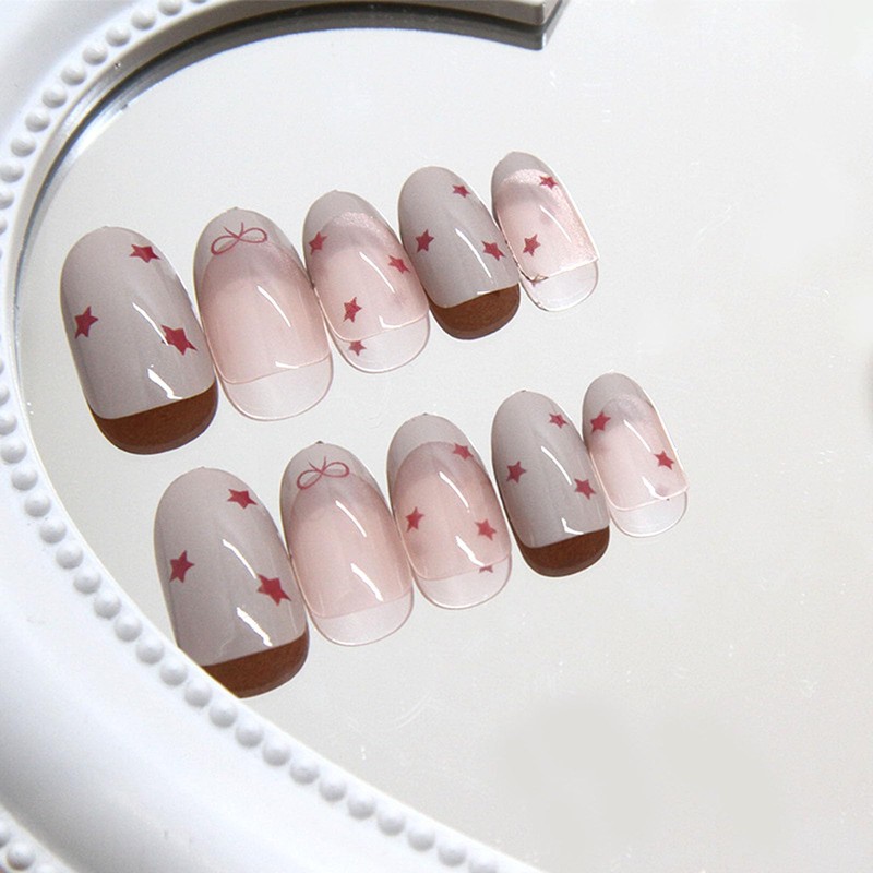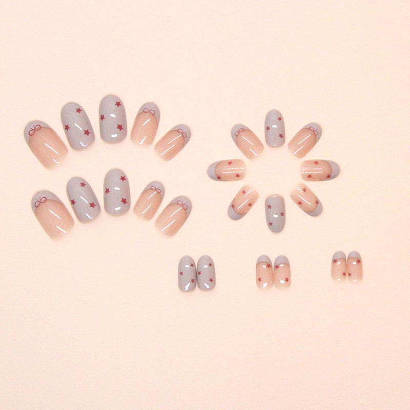 Short Press on Nails Oval Fake Nails with Red Bow Stars Designs Gray French Tip Glue on Nails Press ons Nude Translucent False Nails Spring Acrylic Glossy Artificial Stick on Nails for Women 24Pcs