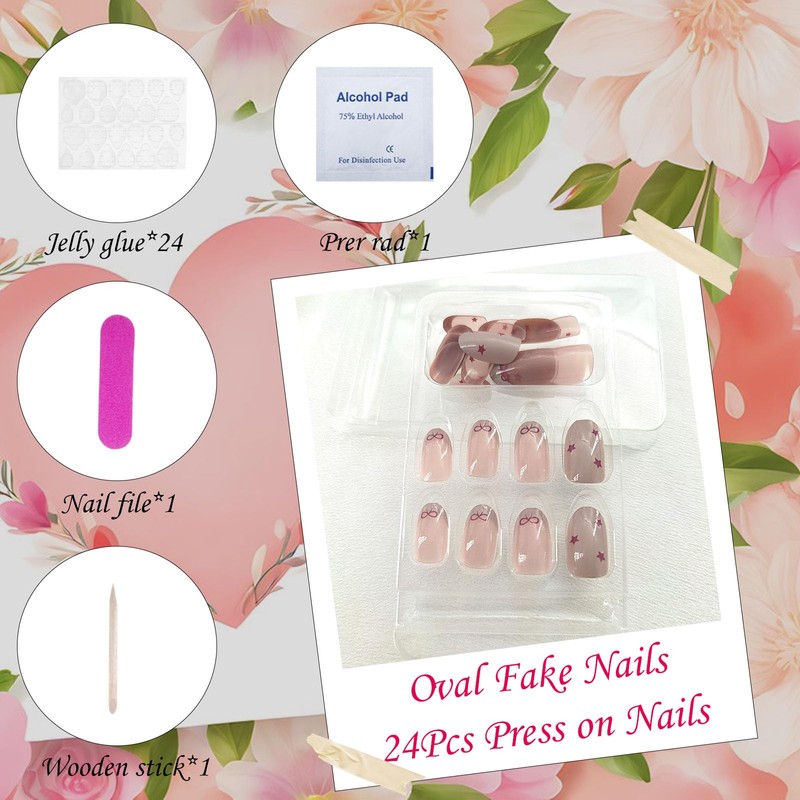 - MAOTTIE Oval fake nails contains 24 pieces full cover nails with 12 different sizes, 1*jelly glue stickers, 1*mini nail File, 1*wooden Stick, 2*cleaning pad. Polish and file to any shape and length you lik