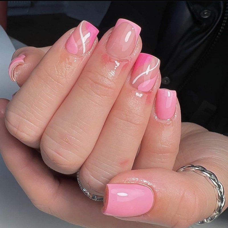 Short Press On Nails Square Fake Nails French Tip Glue On Nails With Pink Designs Acrylic Nails Press Ons Full Cover False Nails Artificial Glossy Stick On Nails For Women 24Pcs