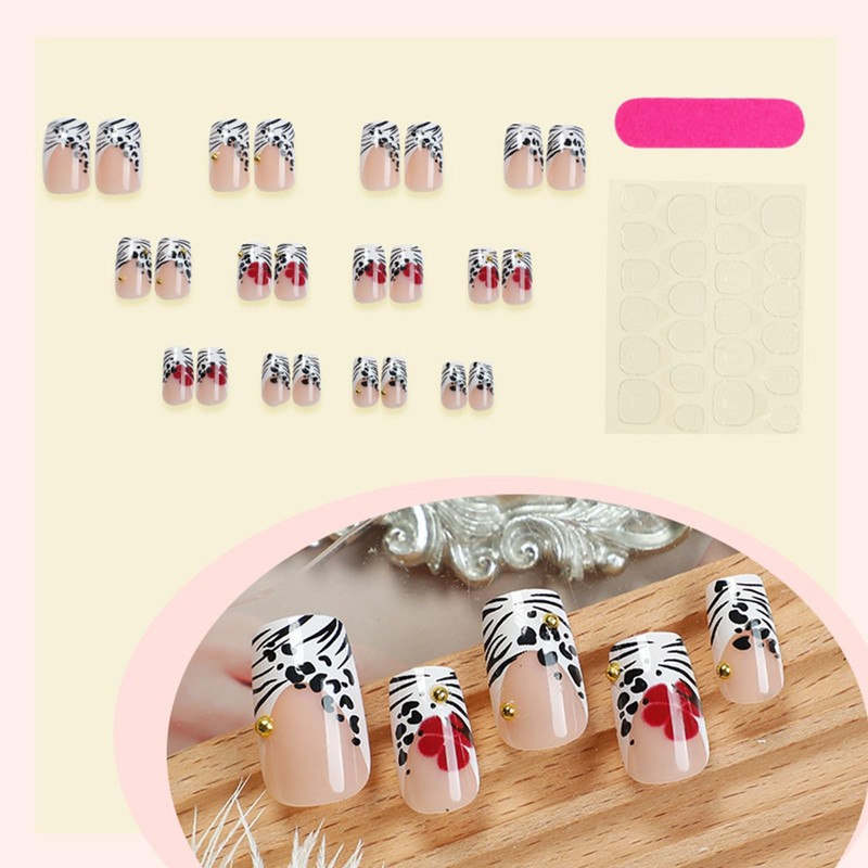 Short Press on Nails Square Fake Nails with Zebra Leopard Print Designs French Tip Nails Red Flower Gold Bead Acrylic Nails Glossy Glue on Nails Full Cover Stick on Nails for Women 24Pcs