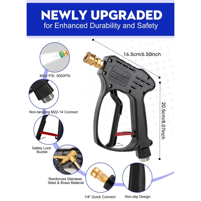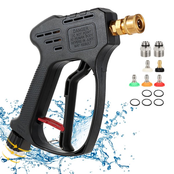 Short Pressure Washer Gun, 5000 PSI Max Swivel High Pressure Washer Handle with 5 nozzles, M22 14MM Swivel Connect & M22 15MM, Car Washer Extension Wand Power Washer Gun for Driveway, Yard, Fence