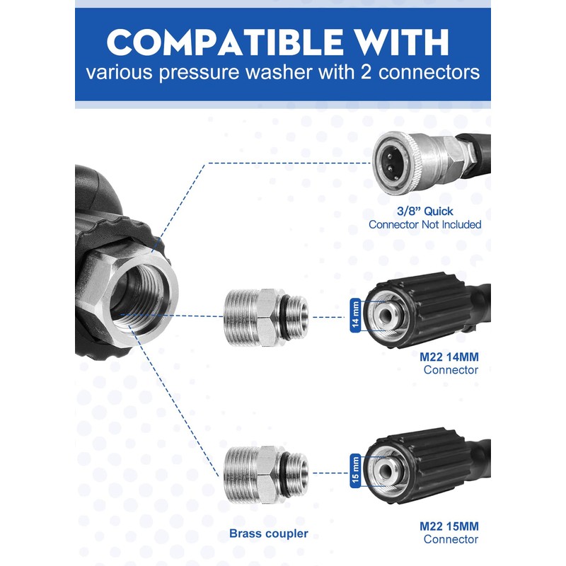 - [Complete Adapter Set] Ready for any setup! Fittings come pre-installed with M22-14mm and M22 15MM, plus rubber rings for a secure fit. The wide variety of accessories can be compatible with most cleaning machines.