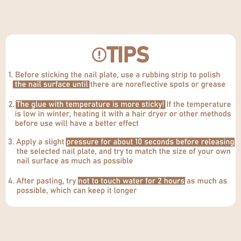 1.Avoid touching water within 2 hour after the fake nails are put on.