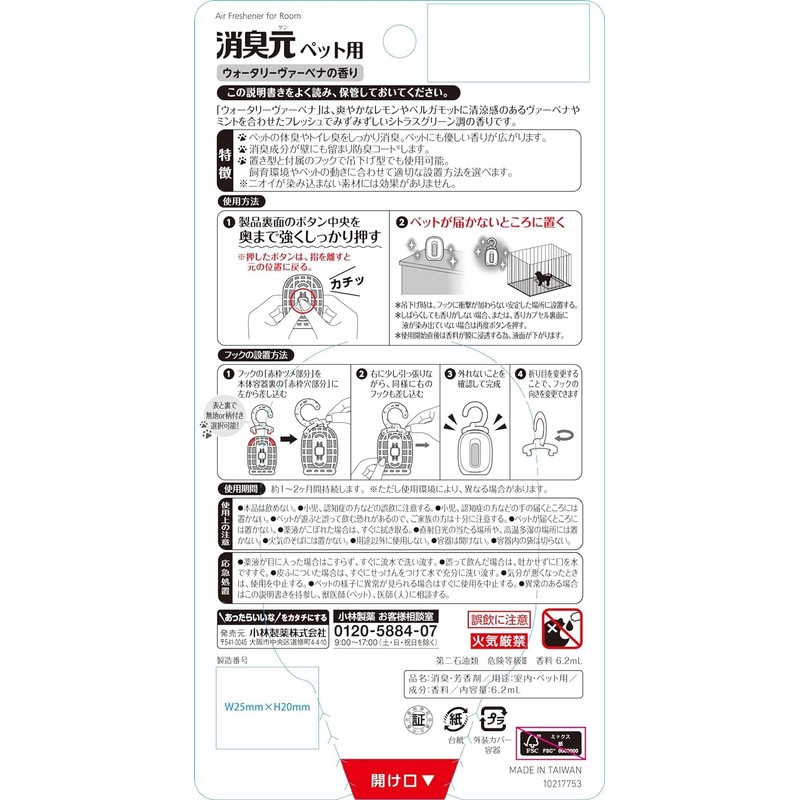 Shoshumoto Watery Verbena, For Pets, Deodorizer, 24-Hour Deodorizer, Anti-Odor Coat, Pet Friendly, Hangable, Deodorizer