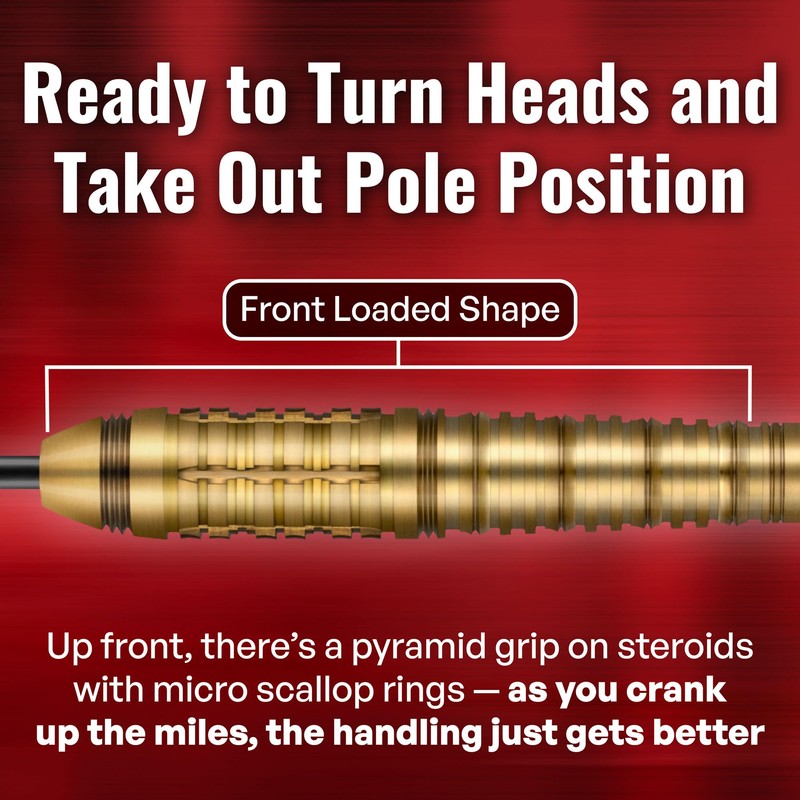 Built for speed and powerful handling, this is a slick, high-performance dart set with a 4/5 grip to fuel your game. MACH1's torpedo-shaped barrels are coated in custom gold titanium for strength, and the ultra-durable Aluminium shafts included are built to last. The tapered barrel design features a hybrid ring grip with a massive feel that won't bite. Up front, there's a pyramid grip on steroids with micro scallop rings – as you crank up the miles, the handling just gets better. This rig is ready to turn heads and take out pole position.