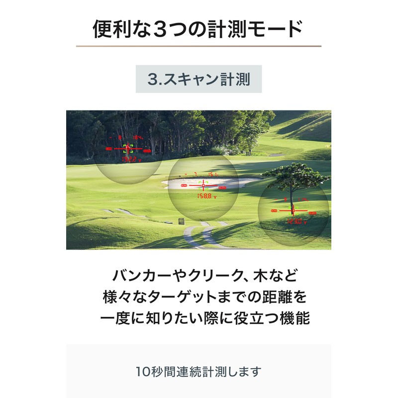 - (3 Convenient measurement modes) 1. Normal measurement (short press); The mode measures the distance to the location where the laser is illuminated. Look at the viewfinder and measure the distance to the center of the target mark displayed on the screen. 2. Continuous measurement (press twice): Continue measuring continuously for 10 seconds, and the display distance will always change. 3. Seek measurement (long press)... Pin search auxiliary mode. If you are difficult to aim for the pin, look for something in advance than the first measured object. The pin flag will display a mark when aiming is matched, and the number will be locked as you complete the measurement