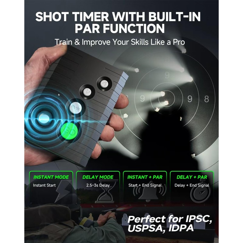 - 6 Training Modes with Built-In PAR: Our shot timer for shooting competition offers Instant, Delay, PAR Instant, and PAR Delay modes, plus Review and Set functions for complete flexibility. Whether you’re at the indoor shooting range, outdoor training field, shooting club, competition stage, or practicing dry-fire drills at home, this timer adapts to your needs with precise timing and easy operation.