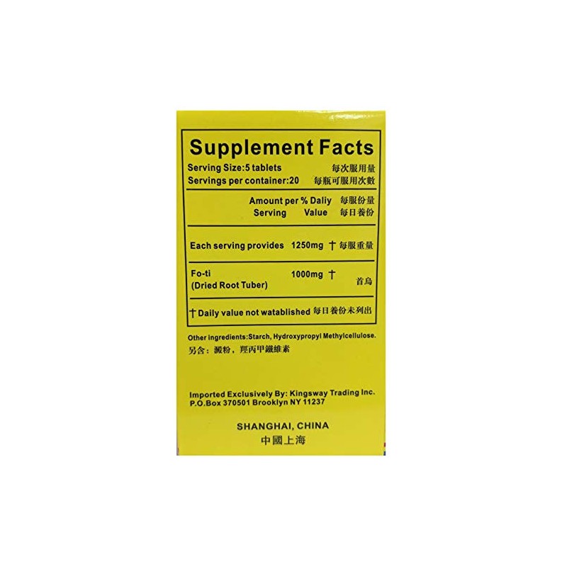 Ingredients: Shou wu root Contents: 100 tablets (250mg each) Directions: As a