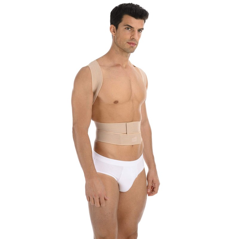 - Elastic fabric with back support with flexible screen bars, back crossing and abdominal adjustment