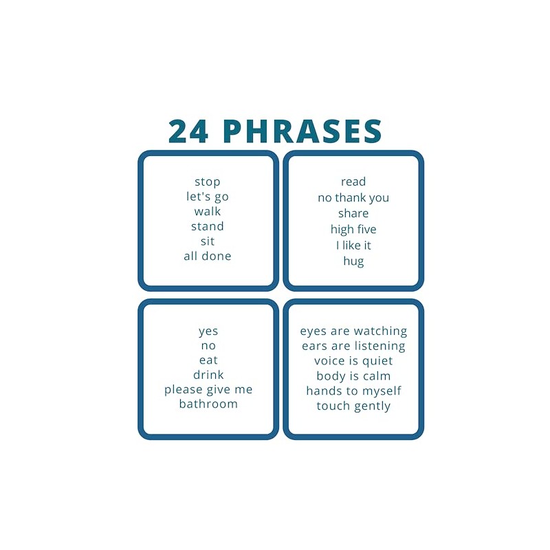 yes, no, stop, let's go, walk, stand, sit, eat, drink, please give me, no thank you, share, read, all done, bathroom, eyes are watching, ears are listening, voice is quiet, body is calm, hands to myself, touch gently, high five, I like it, hug