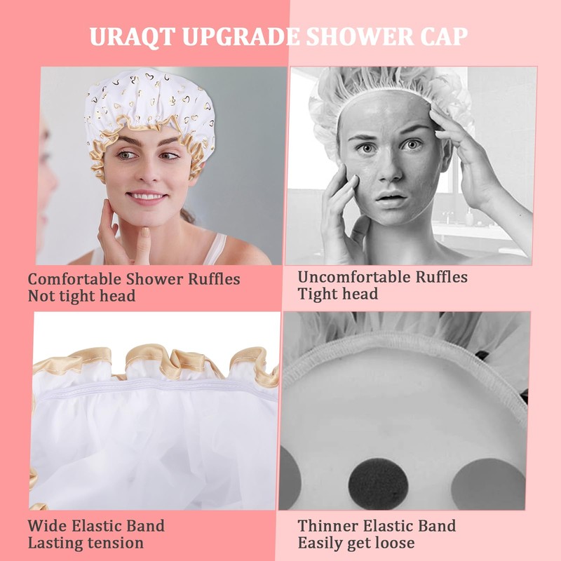 - High elasticity: Our shower caps for women are of good quality, the elastic band on the bottom leaves no terrible marks on your forehead. The good elasticity of the elastic band makes the shower cap durable and can be used to hold hair when showering or cleaning.