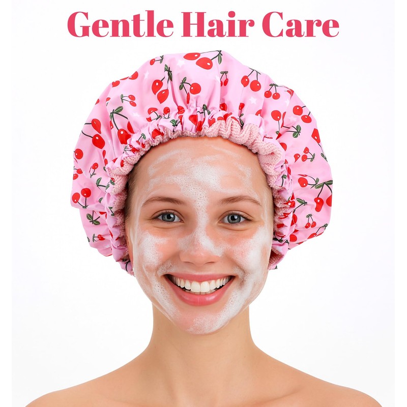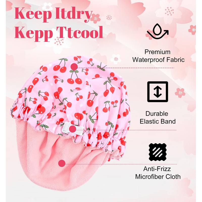 - Cherry Print Style - The vibrant pink terry lined shower cap for women showcases a playful cherry pattern that adds a cheerful touch to your bath routine; Designed for both function and visual appeal