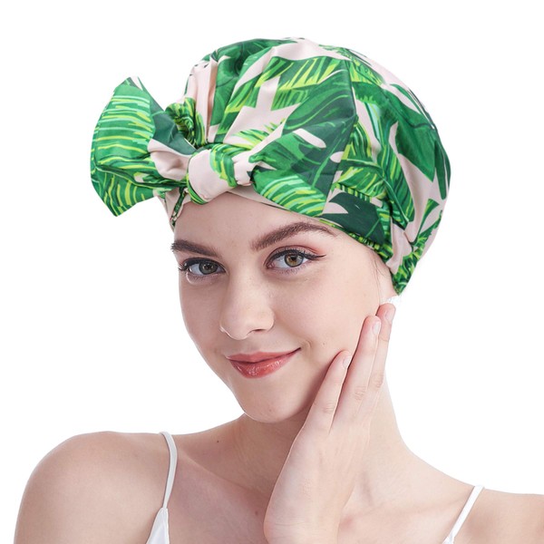 Shower Cap - Women Bowknot Bath Cap Double Layer Large Reusable Shower Hat Fo...