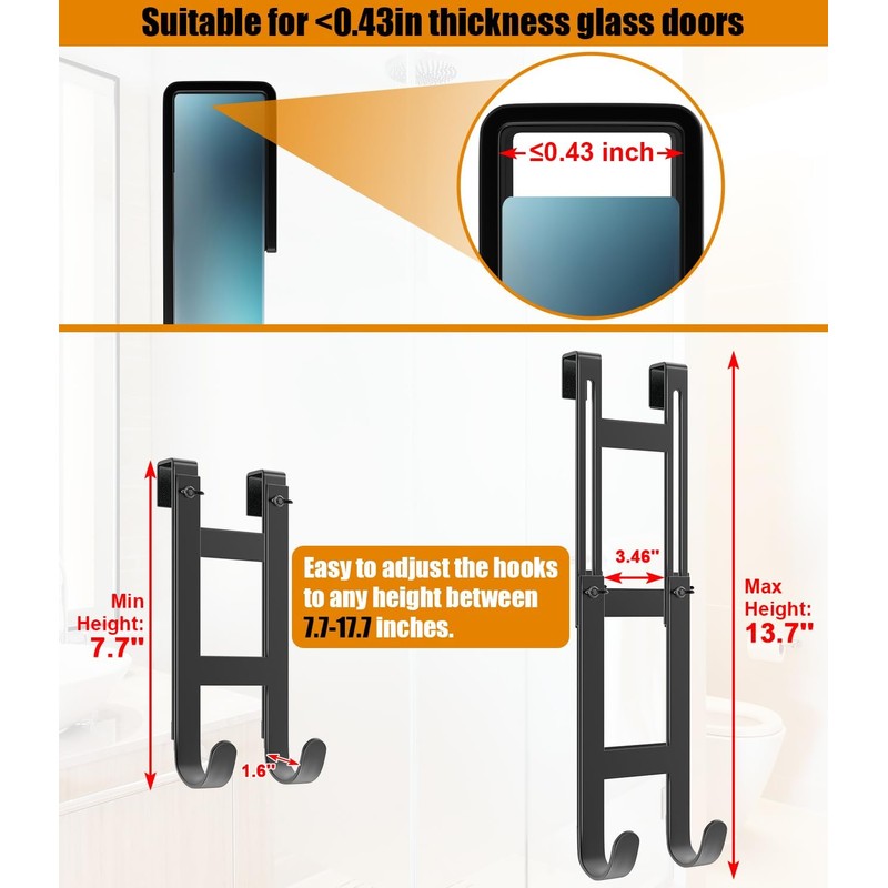 • Customizable Height & Spacing: These shower hooks for towels feature 7"-17.7" height adjustment to suit adults and kids, with 3.46" towel hook spacing for bulky bathrobes and towels. Perfect as over shower door towel hooks.