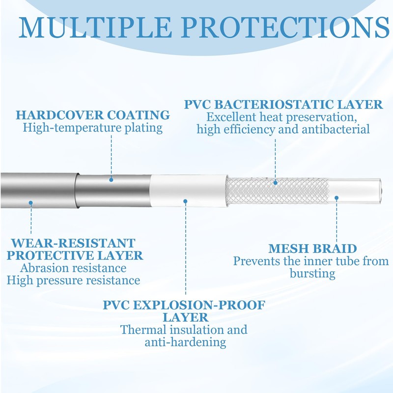 - DURABLE 5 LAYER PVC MATERIAL Our shower hose is made of a 5-layer high quality PVC which provides excellent resistance to high temperatures up to 90 degrees Celsius. This material guarantees a long service life and prevents bursting under pressure.