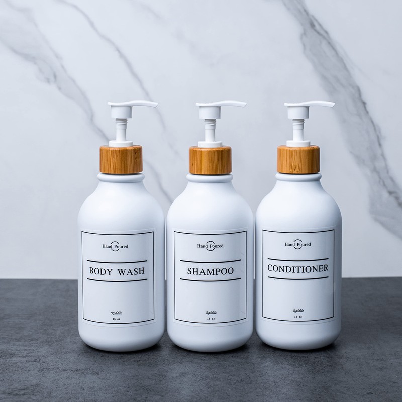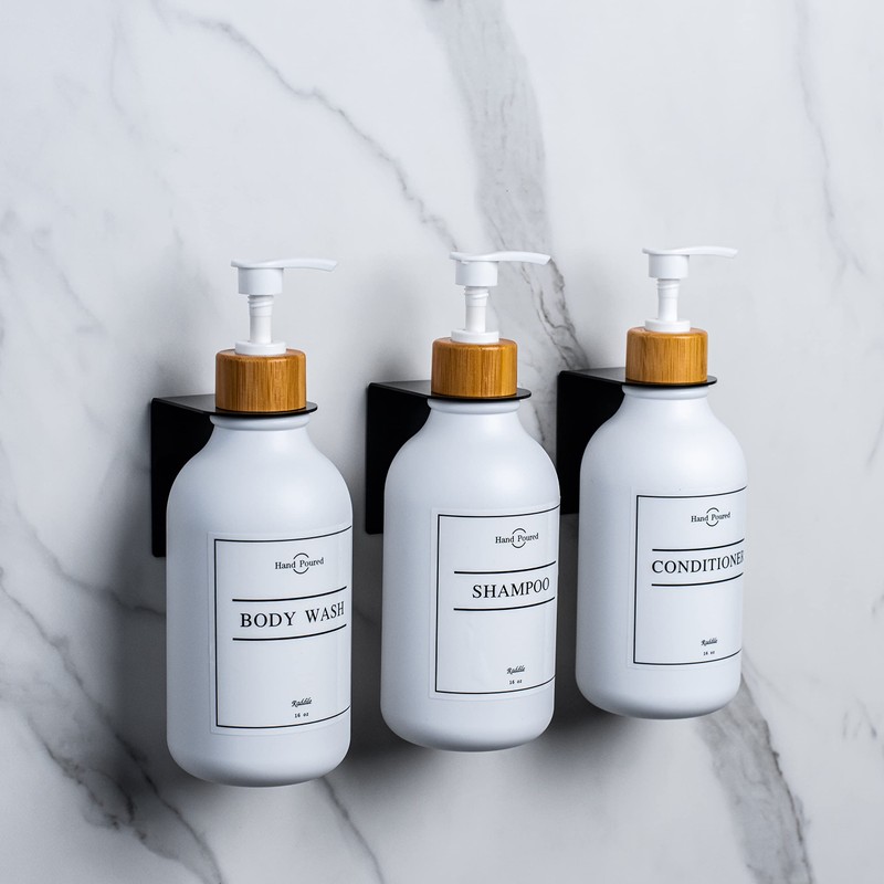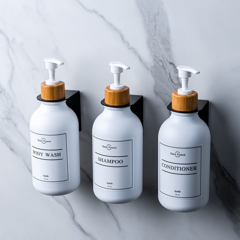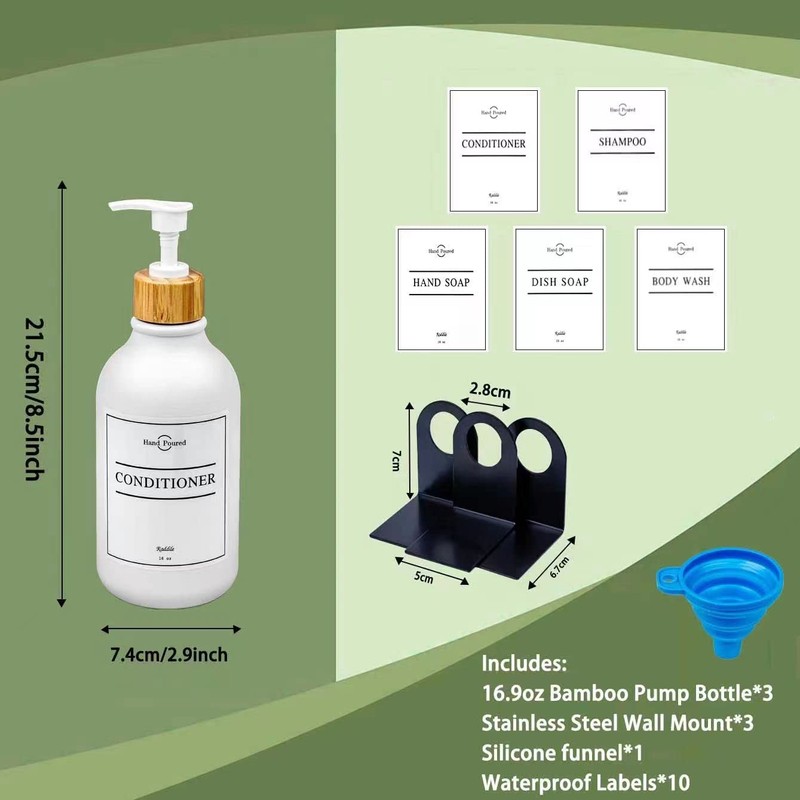 - This set includes: 3 x extra thick PET plastic bottles, 3 x wall brackets with adhesive, 10 x waterproof labels, including 2 hand soaps, 2 dish soaps, 2 shampoo, 2 dishwashing liquid, 2 body wash, 1 silicone funnel.