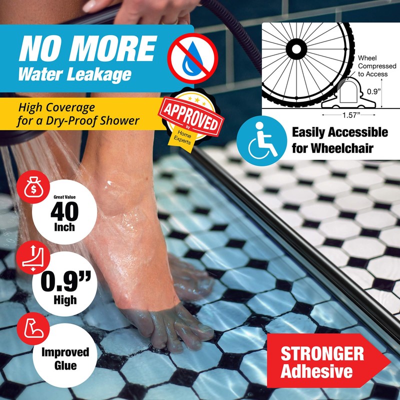 - [DURABLE SHOWER DAM] Measuring 40" L x 0.905" W x 1.57" H, our shower water dam is designed to provide a reliable barrier against water leakage. Its flexible yet sturdy construction makes it a great shower dam for walk in shower.