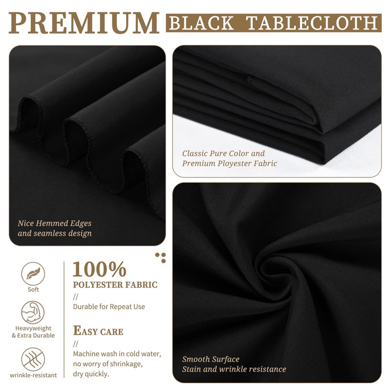 • 🍹【Washable Polyester Table Cover】These rectangle tablecloths are machine-washable with no need for expensive rental or dry cleaning fees.And they’ll come out looking good as new.No loss threads, stubborn stains, or shrinkage.Wrinkle free after ironing.You can reuse it for years to come.Our polyester black table clothes have an elegant look with neat seams,nice hemmed edges and seamless construction.Provide a low-key sense of luxury for your table.