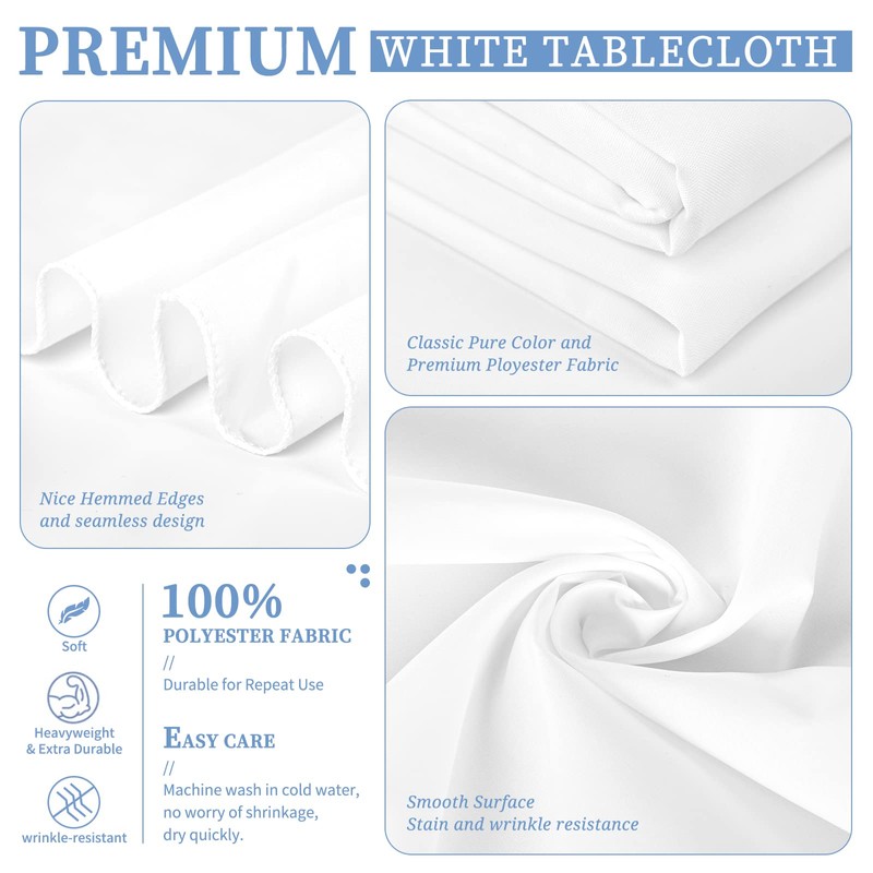 • đŸ·ă€Easy to Care】Showgeous polyester tablecloth is easy to clean, machine washable and hand washable, tumble dry low to relieve the creases from being folded in the package, iron or steam as needed to reach perfection.The white table cloth rectangle 8ft is stain and wrinkle resistant.No worry about juice, red wine, sauce, gravy or other food being spilled on your table cloth, any spots come out easily and will not fade during washing or use.