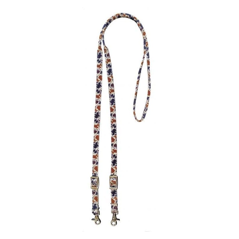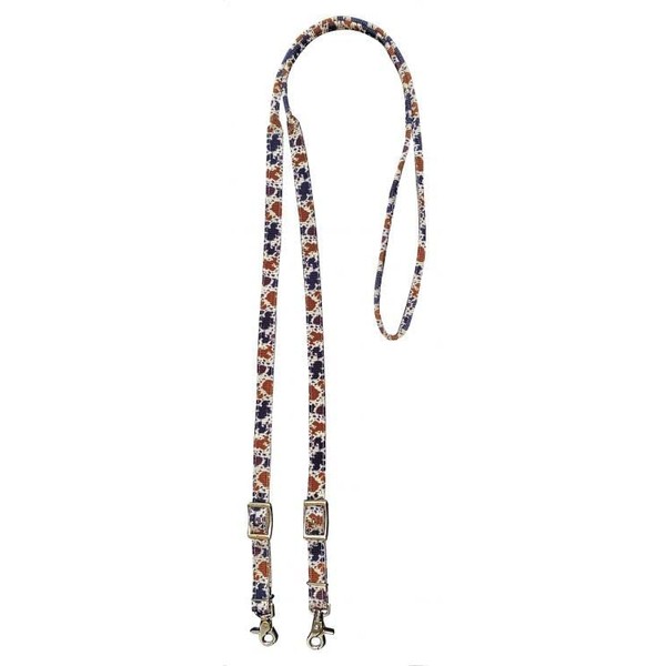 Showman Cow Print Nylon Contest Reins. These reins feature a cow print flat woven nylon with rolled center. Easily attach with scissor snap ends and conway buckles. Reins measure 3/4" wide x 8' long.
