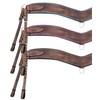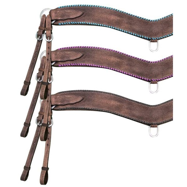 Showman Rough-out Leather Tripping Collar w/ Rawhide Wrapped Edges. This tripping collar features dark rough-out leather with colored rawhide wrapped edges and stainless steel hardware. Collar measures approximately 4" wide. For an average full size horse. Available Colors: Black, Pink & Teal.
