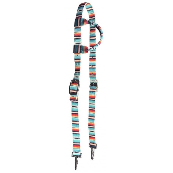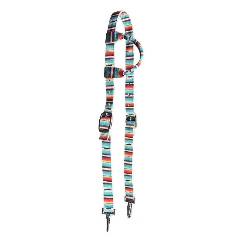 Showman Serape Nylon Single Ear Headstall. This headstall features 2-ply nylon with teal serape print and easy change bit loops. Headstall adjusts 15" to 19" crown to cheek with nickel plated buckles. For an average full size horse.