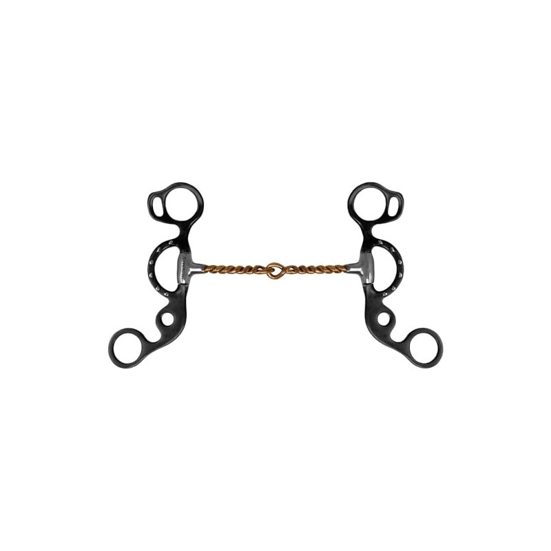 Showman Short Shank Twisted Copper Wire Snaffle Bit. This type of bit is designed to provide gentle and effective communication between the rider and the horse, allowing for precise control and responsiveness. The short shank design ensures that the bit is mild and easy to handle and control, while the twisted copper wire snaffle provides a comfortable and effective contact point for the horse's mouth. The copper material is soft and warm, which encourages the horse to salivate and accept the bit. This type of bit is ideal for horses with sensitive mouths. Experience the craftsmanship of a handcrafted Showman bit - each component is expertly welded, formed and ground by hand.