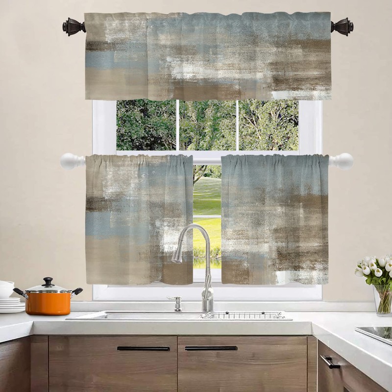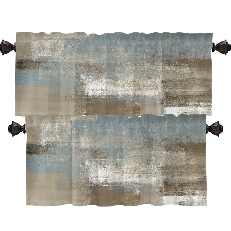 Shrahala Taupe Squares Texture Kitchen Valances, Grey and Beige Abstract Painting Half Window Curtain Window Treatment Multilayer Polyester Blackout for Living Room Bathroom 2 Pack 52 x 16 in