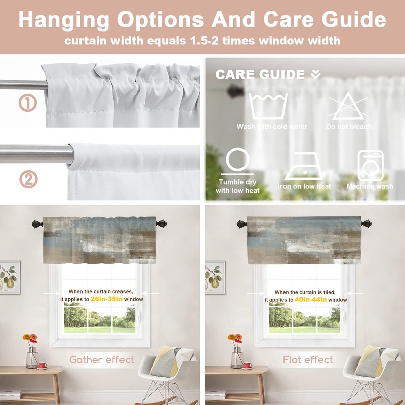 - Packing-Two valances. 52''Wx16''L, plus 2 inch header and 3 inch rod pocket. When the curtain is tiled, it is suitable for 40in-44in window; when the curtain creases, it is suitable for 26in-35in window. Rod pocket construction slides easily onto your curtain rod for quick installation.