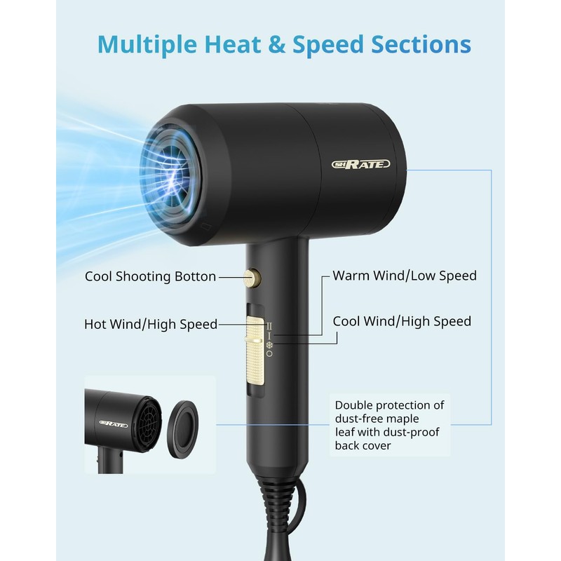 - ★Strong airflow, dry fast without hurt hair- Our hair dryer engine speed is 20,000 rpm, airflow is 3.2m³/min, air volume is up to 27.3m/s, noise is only 80 dB, use fast and quiet 1800W AC motor. High-quality 18 fan blades can produce fast and stable airflow, and the drying speed is very fast. Our hair dryer innovative dust-free fan blades. It is easy to avoid the entry of dust.