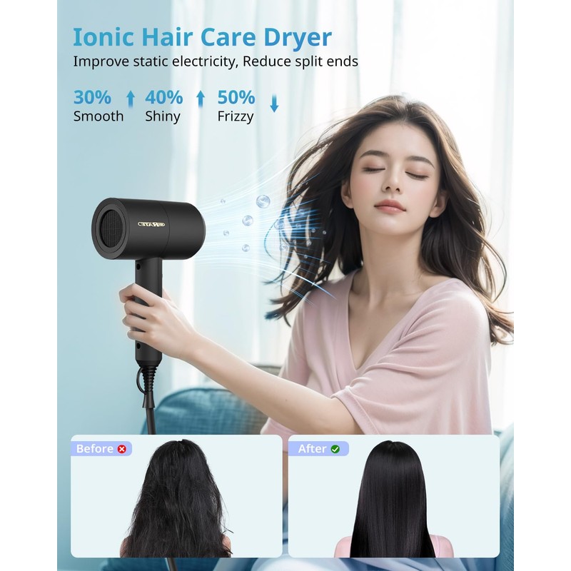 - ★134.6 °F constant temperature hair care, negative ion technology-Reduces moisture loss and damage to the hair due to overheating, and protects the gloss of the hair. Our hair blow dryer's negative ion teschnology reduce frizz and enhances shine. Let you be full of charm and confidence throughout the day.