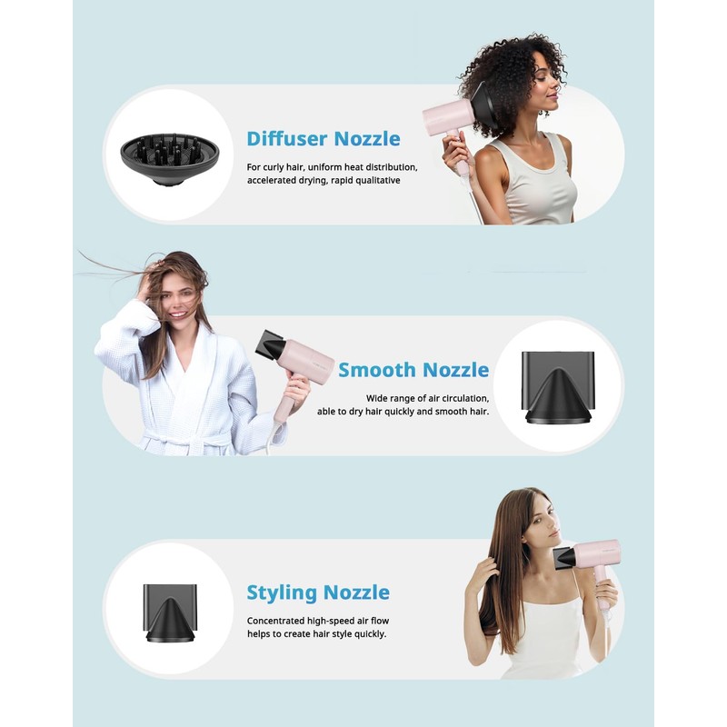 - Three Nozzle Attachments: Master All Hairstyle You WantOur SHRATE hair dryer comes with three different nozzle attachments, a diffuser nozzle, a smooth nozzle and a styling nozzle. Whether you want natural curls, silky smooth hair, or sophisticated styling, we've got you covered. Use diffuser nozzle for voluminous curls, smooth nozzle for sleek hair and styling nozzle for versatile styles. With SHRATE, turn your daily routine into a masterpiece of hairstyling versatility, with each nozzle attachment designed to help you effortlessly achieve the look you want